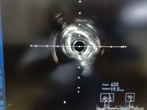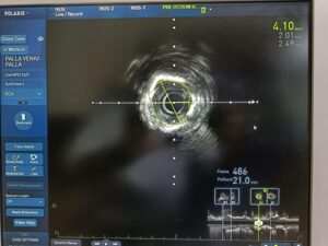 The imaging showed extensive severe calcium with mixed morphologies, confirming that the lesion was not only heavily calcified but also structurally complex. This is exactly why intracoronary imaging is so important in advanced calcium cases.